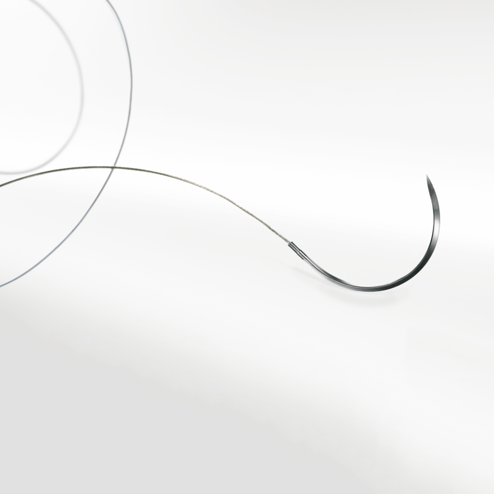 Sutura no absorbible torsionada o monofilar de acero inoxidable.